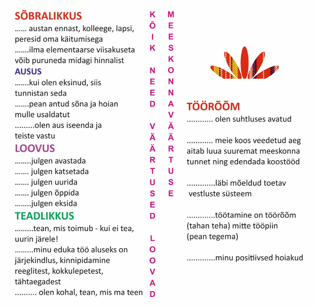 Miski ei tekita meeskonnas ühist tunnet paremini, kui jagatud väärtused. Väärtused on osa inimese olemusest, mis juhivad käitumist.Väärtused on meie sisemised tõekspidamised, mis näitavad, mida me hindame ja tähtsaks peame.
